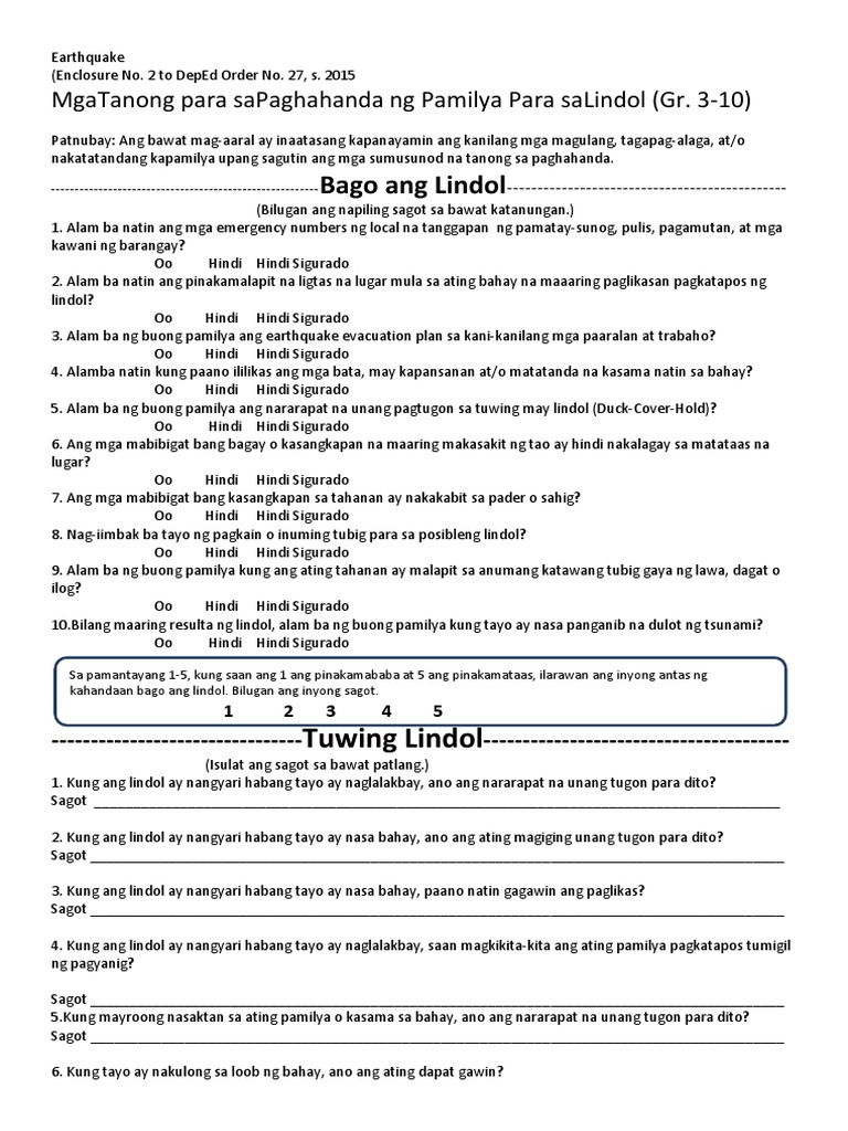 Tuwing Lindol 4. Kung ang lindol ay nangyari habang tayo ay nasa bahay paano natin gagawin ang paglikas. Kung ang lindol ay nangyari habang tayo ay naglalakbay saan magkikita- kita ang ating pamilya pagkatapos tumigil ng pagyanig.