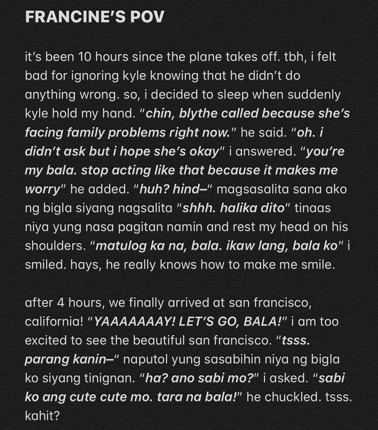 Gusto ko yung sa bawat paghinga ko bawat galaw ko ipaparamdam nya sakin na di ako nag iisa. Pero parang pamilyar sa akin ang mukha ng lalaki. Kapag sinabayan ka kasi niya sa pagkanta ibig sabihin ay nagtutugma ang mga isip niyo o gusto niya i-match ang iniisip niya sa.