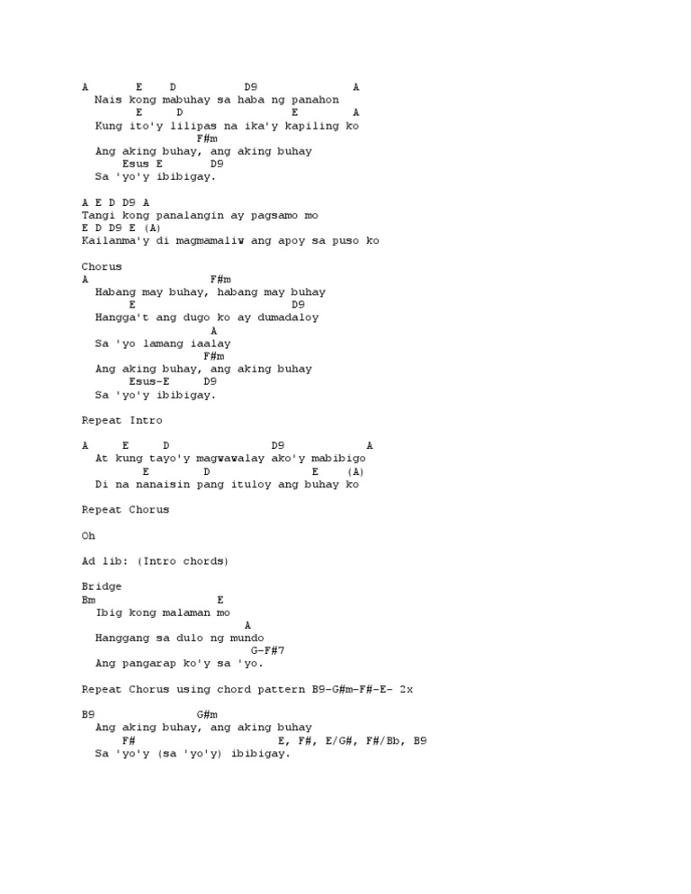 A E D D9 A Tangi kong panalangin ay pagsamo mo E D D9 E A Kailanmay di magmamaliw ang apoy sa puso ko Chorus A Fm Habang may buhay habang may buhay E D9 Hanggat ang dugo ko ay dumadaloy A Sa yo lamang iaalay Fm Ang aking buhay ang aking buhay Esus-E D9 Sa yoy ibibigay. Songs chords D Fm F Em G A Bm Dm. Pangako mo nung una Bm tiwalay iingatan.